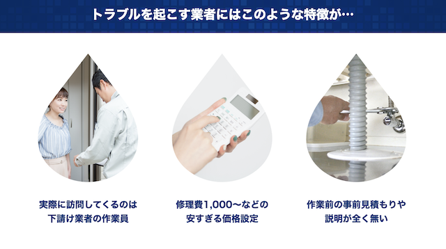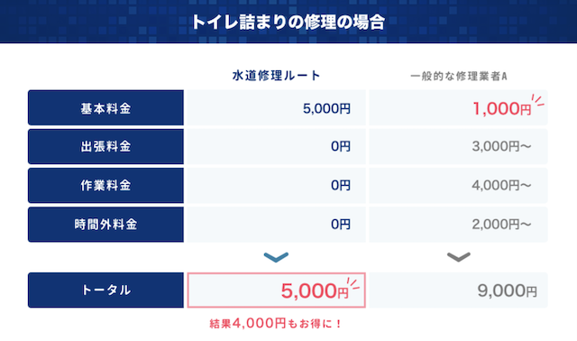 水道修理業者には、一見すると価格が非常に安い業者もたくさんあります(基本料金1,000円など)。しかし、そのほとんどは見せかけのものであることが多く、実際には出張料金や作業料金、時間外料金などの名目で高額の請求をされる場合も多いです。
